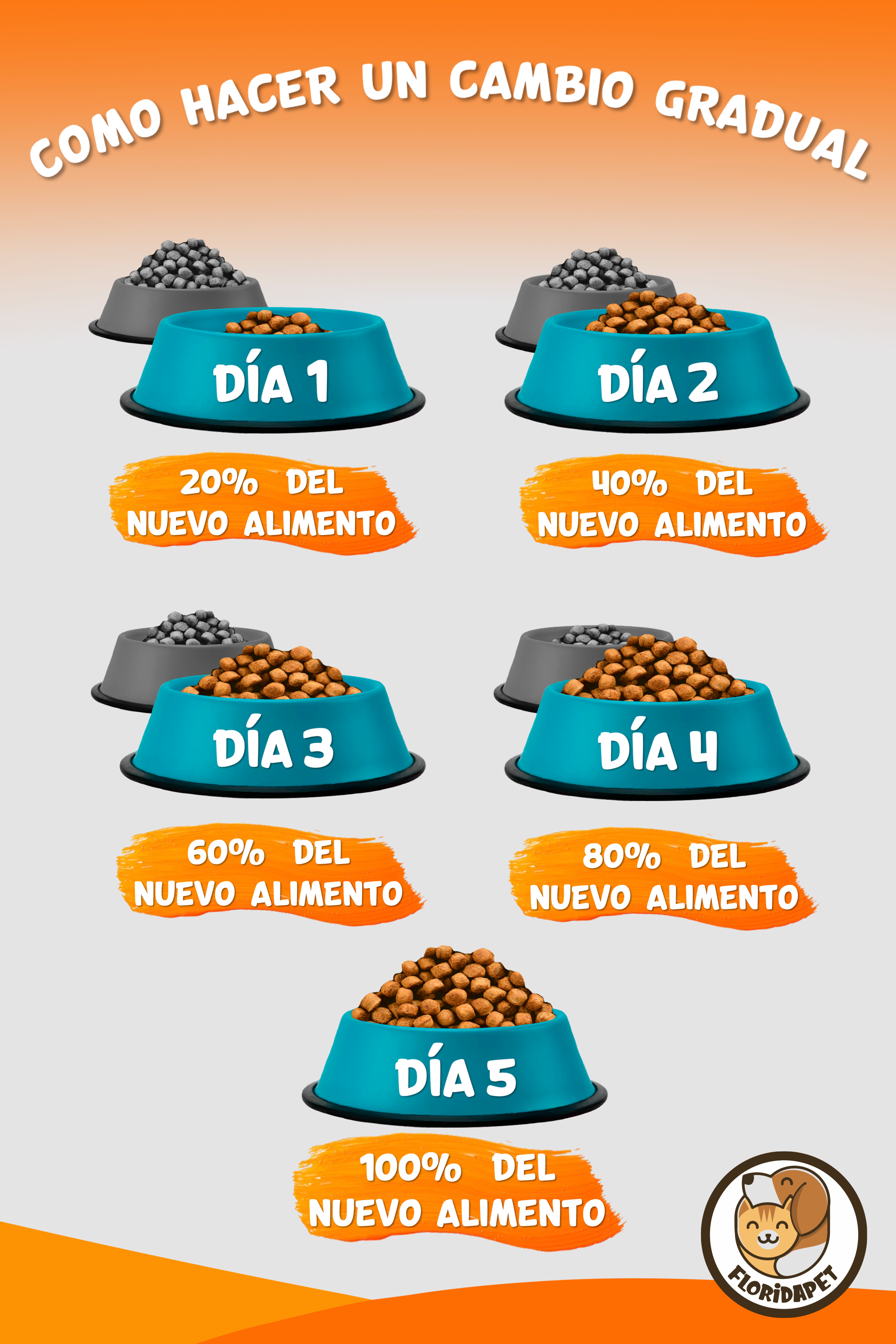Puede que ya se acerque el momento de cambiar el alimento de tu mascota, ya sea porque tu perro pasa de la etapa de cachorro a la de adulto o de adulto a senior, porque tienes que ponerlo a dieta, o porque necesite una formulación diferente por alguna razón. El cambio de alimento de un perro tiene que hacerse de forma gradual para evitar posibles molestias estomacales. Por lo general, este proceso tarda unos 5 días, aunque es importante observar el comportamiento de tu mascota para asegurarte de que todo esté bien y poder recurrir a un especialista en caso de necesitarlo.