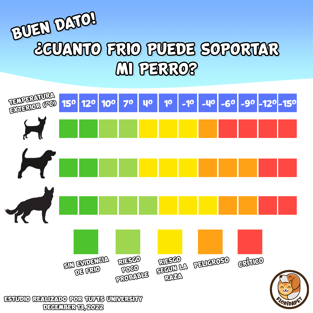 ¿Han notado como algunas madrugadas ya están siendo muy frías? pues resulta que los perritos también lo notan, en especial si son de exterior, es por esto que les dejamos una sencilla tabla basada en un estudio de Tufts University Massachusetts sobre el frio que pueden soportar los perritos.